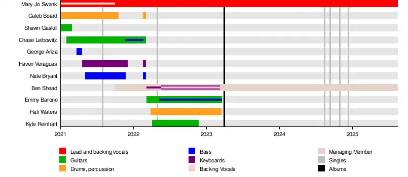 In September 2021, Ben Shead joined the band as their manager, making his first public appearance with them during an interview at the Endless Summer Festival in Hull, Massachusetts.[7] Shead has also contributed to several original songs, with credits including writing, production, keys and backing vocals.[8] He is seen playing piano in a YouTube cover of My Chemical Romance's "I Don't Love You".[9] and occasionally performs live with the band.