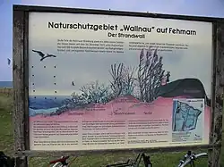 The Wallnau Waterbird Reserve (German: Wasservogelreservat Wallnau) is one of the most important reserves for migratory birds in Germany and the largest of NABU's nature conservation centres. The former pond estate of Wallnau lies on the west coast of the Baltic island of Fehmarn and covers, in its core zone, an area of just under 300 hectares (740 acres), of ponds, reed beds and meadows as well as part of the Baltic Sea and its fringing beaches. The nature conservation centre houses an exhibition on bird migration, a small restaurant and seminar rooms. Paid and volunteer workers look after conservation-related work and public relations. The centre is certified as the provider of education for sustainable development.