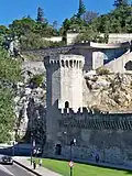 The only surviving piece of the 13th century fortifications is a small fragment of the outer wall at the junction of rue Joseph-Vernet with rue Saint-Charles.[14] Much of the path of the double defence is preserved in the city plan as modern streets follow what was once the gap between the two city walls. Working clockwise from the northeast the walls followed the rue des Trois-Colombes, the rue Campane, the rue Paul-Saïn, the rue Philonarde, the rue des Lices, the rue Henri-Farbe, the rue Joseph-Vernet and the rue Grande-Fusterie.[10] The path of early walls in northwest corner of the town near the Pont Saint-Bénézet is obscure due to the subsequent changes to the fortifications in this important area.[15]