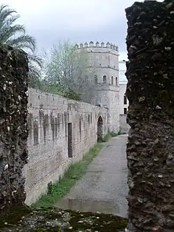 - • The areas of mud made by the Almohads, some visible, as in the calle Judería, and calle Agua and others that are not visible because these are hidden by buildings of Calle San Fernando -except in some that are public-. Parallel to the walls of the alcázar, was the walls of the city, whose remains were found during works of the Metro, leaving again buried.[8]