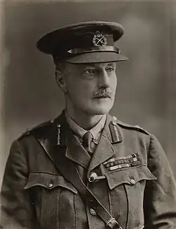 Campbell served in the First World War, receiving a promotion to brigadier general and being assigned as a deputy adjutant and quartermaster general (DAAG), while serving with the British Expeditionary Force (BEF), in October 1914, in succession to Robert Wanless O'Gowan.[14] He was later promoted to temporary major general in July 1915,[15] becoming Deputy Quartermaster-General to the Mediterranean Expeditionary Force taking part in the evacuation at Gallipoli.[16] By June 1918 he was Quartermaster-General with the Imperial Camel Corps in Jordan.[17] According to The Times, Campbell's "genius for administration made him an outstanding figure of the War."[1] He was awarded the Order of the White Eagle, 2nd Class by the Government of Serbia in February 1917,[18] and appointed a Knight Commander of the Order of the Bath in the 1919 New Year Honours.[19]
