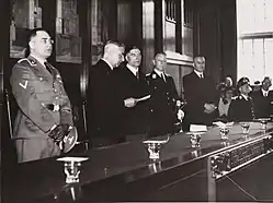 On 27 September 1941, Schröder was promoted to SS-Brigadefuhrer and Generalmajor of Police.[1] From January 1943, he was involved in the political negotiations for the establishment of the Latvian Legion, a military formation largely composed of Latvian volunteers, which eventually grew to contain the 15th Waffen Grenadier Division of the SS (1st Latvian) and the 19th Waffen Grenadier Division of the SS (2nd Latvian).[6]