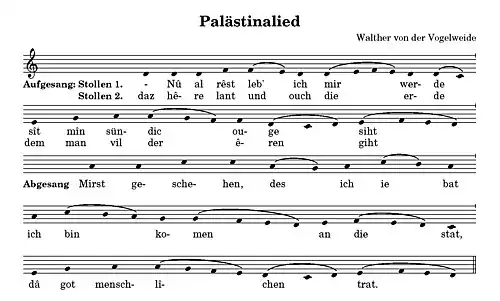 - The complete melody of the "Palästinalied", Nû alrêst lebe ich mir werde (L14, 38; C 7)
