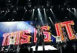 Since March 2009, Jackson was preparing to perform "Wanna Be Startin' Somethin'" during his This Is It concert series from July 13, 2009 to March 6, 2010.[37] During rehearsals at Staples Center for the This Is It comeback concerts at London's The O2 Arena, Jackson's performance of "Wanna Be Startin' Somethin'" contained an a cappella snippet of "Speechless", from Jackson's studio album Invincible (2001).[38] Following Jackson's death in June of the same year, video footage of Jackson rehearsing the song was used as the opening song in the 2009 concert documentary, Michael Jackson's This Is It.[39]