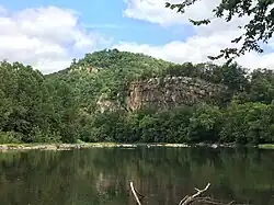Wappocomo farm is located within the relatively flat floodplain of the South Branch Potomac River valley, to the north of Romney.[62] The farm's property adjoins the Valley View farm and Romney corporate limits to the southwest, the South Branch Potomac River to the west and north, and the South Branch Valley Railroad line and Cumberland Road (West Virginia Route 28) to the east. Mill Creek Mountain, a narrow anticlinal mountain ridge, rises to the west of the opposite riverbank of the South Branch Potomac River, and the western foothills of South Branch Mountain rise to the east.[62][63][64] Mill Creek and South Branch Mountains contain Appalachian-Blue Ridge forests of hardwoods and pine.[65] Hanging Rocks, cliffs of stratified Oriskany sandstone and limestone layers, are located within a gap where the South Branch Potomac River cuts through Mill Creek Mountain approximately 3 miles (4.8 km) north of Wappocomo farm.[66] The unincorporated area at Hanging Rocks is known similarly as Wapocomo (or Wappocomo).[67][68]