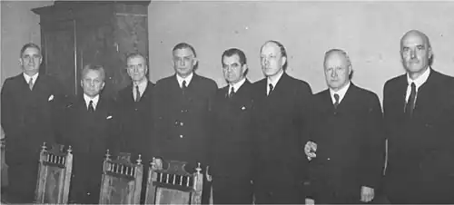The war-responsibility trials in Finland (Finnish: Sotasyyllisyysoikeudenkäynti, Swedish: Krigsansvarighetsprocessen) were trials of the Finnish wartime leaders held responsible for "definitely influencing Finland in getting into a war with the Soviet Union and United Kingdom in 1941 or preventing peace" during the Continuation War, the Finnish term for their participation in the Second World War from 1941–1944. Unlike other World War II war-responsibility trials, the Finnish trials were not international. The trials were conducted from November 1945 through February 1946 by a special court consisting of the presidents of the Supreme Court of Finland, the Supreme Administrative Court of Finland, a professor from the University of Helsinki and twelve MPs appointed by the Parliament of Finland. The accused were convicted and were imprisoned until they were eventually paroled and then pardoned.[1]