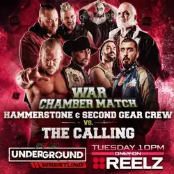 For the past several weeks, various members of the MLW roster would be mysteriously assaulted in the backstage area, with the only sign of the attacker(s) being a calling card with the initials "AO." On the February 28 episode of MLW Underground Wrestling, the mysterious attackers would make their first in-person appearance, attacking Lince Dorado, Microman, and Mister Saint Laurent.[7] The following week, a video package aired revealing the identities of the attackers, who would be dubbed "The Calling:" Raven, Rickey Shane Page and Akira.[8] On the March 21 Underground Wrestling, after MLW World Heavyweight Champion Alexander Hammerstone successfully defended his title against Jacob Fatu, he would be ambushed by The Calling, which featured many more masked henchmen. Later that night, while the Second Gear Crew (Mance Warner, Matthew Justice, and 1 Called Manders) were having an interview on the entrance ramp, the Calling's video feed would briefly interrupt them.[9] The week after that, Hammerstone would meet with the Second Gear Crew in a bar, recruiting them to help him battle the Calling (Raven, Page, Akira, and Dr. Cornwallus) in a War Chamber match.[10]