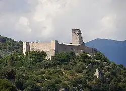 In September, Azzo VII of Este, the papal rector in the march of Ancona, requested permission to abandon his position as Rainald prepared to continue his advance into the march.[58] Ultimately, he chose to remain neutral.[13] In October, Rainald invaded the march, going as far as Macerata, while Berthold remained in Spoleto.[67] Rainald's army included a Muslim contingent.[68] He laid siege to Capitignano and destroyed Popleto, the lords of which were in rebellion.[69] His capture of Foligno, not far from where the pope was staying at Perugia, particularly inflamed tensions.[30] He also expelled the Franciscans from the Kingdom of Sicily on the grounds that they were acting as papal messengers.[70] In November 1228, Gregory excommunicated Rainald and Berthold.[30]