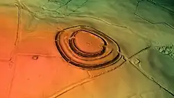 The inner rampart has two original entrances, inturned and facing each other, on the north-west and south-east, and there are corresponding simple entrances in the outer rampart.[1][3]