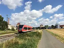 The Burgwald Railway (Burgwaldbahn) is the 26 km long southern section of the Warburg–Sarnau railway. It opened on 1 July 1890.[23] The Burgwald Railway branches off the Kreuztal–Cölbe railway in Sarnau and runs through the Wetschaft valley to Frankenberg, where the lines to Bad Berleburg and Winterberg branched off. The passenger traffic consisted largely of travellers bound for Marburg, Korbach, Frankenberg or the Frankfurt Rhine-Main region. Freight traffic on the line, which was only of a regional nature, was sometimes significant. The most important railway junction on the line was Frankenberg, but from the 1960s onwards it became less and less important and with the closure of the Upper Edertal Railway in 1981 and the Lower Edertal Railway in 1987 it was left as only a terminus for trains from Marburg. Passenger and freight traffic also decreased significantly on the Burgwald Railway. From that time, there were repeated reports that the Burgwald Railway would be closed. In 2002, when the Kurhessenbahn integrated the Burgwald Railway into its network, which was operated with then modern class 628 railcars, the decline in passenger traffic was stopped, but freight traffic continued to decline sharply. Until 2005, it was the only branch line in Hesse with daily freight traffic. Today, it is still served by occasional trains carrying timber from Frankenberg, Battenberg and a siding in Allendorf. It is likely that it will be completely closed in the next few years, as the ability to operate on the line to Battenberg is only guaranteed for four years and numerous speed limits will be imposed on the trains.