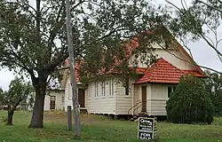 In April 1907, Samuel Alexander Taylor of Logie Plains pastoral station decided to build a Presbyterian church in Warra at his own expense.[11] It is unclear when the Presbyterian Church opened, but it was in operation by May 1908.[12][13][14] In the 1970s, when the Uniting Church in Australia was created through amalgamation of Presbyterian, Methodist and Congregational churches, it became Warra Uniting Church. In 2005, the church at 14 Lytton Street (26°55′52″S 150°55′07″E / 26.9311°S 150.9187°E) was sold into private ownership and then converted into a residence.[15]