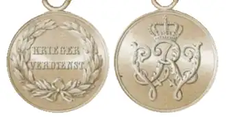 The Warrior Merit Medal (German: Krieger-Verdienstmedaille) was a military decoration of Prussia. Established by Friedrich Wilhelm III, it was primarily awarded to troops not in Prussian Army military service. The first recipients were members of the Imperial Guard grenadier company guarding the Russian imperial residence during Friedrich Whilhelm's visit to St. Petersburg in 1835.[1]