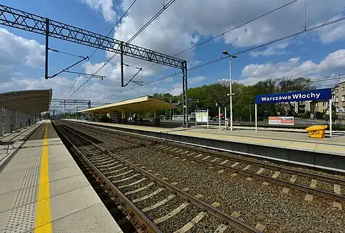 Warszawa Włochy railway station is a railway station in the Włochy district of Warsaw, Poland. It stands on the junction of lines 1 and 3: from here trains can either run on Line 1 towards Łódź or Line 3 towards Poznań. It comprises two platforms connected by an underground pedestrian tunnel and a station building complete with ticket machines and bicycle parking.