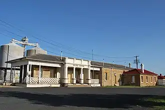 The station building is also a single-storeyed sandstone building on a north–south axis, with the platform running along its eastern side. The western facade features an entrance portico and verandah. The roof is hipped and mainly of corrugated asbestos cement sheet, apart from the kitchen wing which is corrugated iron. Above the roof are two rendered chimneys with decorative mouldings and a cornice. There is a cantilevered steel awning over the platform, which continues past the Station building in both directions.[1]