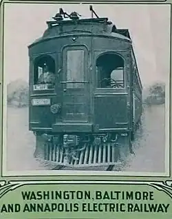It was built by a group of Cleveland, Ohio, electric railway entrepreneurs to serve as a high-speed showpiece line using the most advanced technology of the time.[1] The WB&A absorbed two older railroads, the Annapolis and Elk Ridge Railroad and the Baltimore & Annapolis Short Line, and added its own electric streetcar line between Baltimore and Washington. It served Washington, Baltimore, and Annapolis, Maryland, for 27 years. In 1935, the railroad was sold at auction, undermined by the Great Depression and the rise of the automobile.