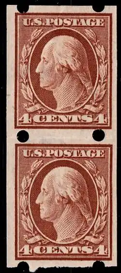 Postage stamps issued in sheets with no perforations between the rows and columns of individual stamps are referred to as imperforate. The Washington–Franklin issue contains several series of imperforate stamps that occur on a small range of denominations from 1 through 5-cents. These stamps were issued in imperforate form to accommodate several major vending machine companies of that period who used this stock for coil stamps in their machines which were in wide use about the country. Many of these companies applied their own form of perforations, such as the Schermack, Mail-O-Meter, and Brinkerhoff vending machine companies. There were at least seven such firms, each having its own patented machines. Imperforate stamps were issued in full uncut sheets of 400 subjects or in coil rolls of 500 or 1000 stamps. The imperforate issues were printed from a flat plate with 400 subjects until 1918 when they were produced on the rotary press from continuous rolls of paper. Imperforate coils from this stock are much rarer than examples cut from full sheets.[1][3]