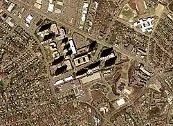 Following Benn's death in 1967, interest in re-purposing the Washington-Virginia began in earnest.[3] In 1968 John D. Benn Jr. announced that he was in discussions with the Charles E. Smith Companies, a Washington D.C. area real estate developer, to convert the airport to an office complex. Earlier in the decade, Smith had converted a large underutilized area of Arlington County into a $120 million complex of offices and high-rise residential buildings called Crystal City. Benn stated that a similar development would be constructed at the location of the airport.[23][24] Plans were finalized a year later when the Benn family sold the airport to the Smith Companies, who announced plans to construct a $200 million office, retail and residential complex that would feature eight apartment buildings and underground parking for over 11,000 cars.[25] The airport closed on October 18, 1970.[1]
