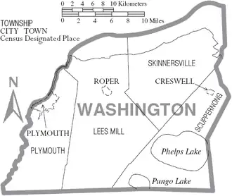 There are three incorporated towns in Washington County; Plymouth is the county seat, while other towns are Roper and Creswell. Washington County is known for rich farmland, extensive forests and abundant public access waters.[3] The Roanoke River and Albemarle Sound form the northern boundary. Lake Phelps is 16,000 acres and is part of Pettigrew State Park in Creswell. Somerset Place is a restored antebellum plantation and NC Historic Site on Lake Phelps.[4]