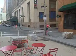 With an epoxy gravel placed over the street, it contained granite blocks, red chairs, tables, and potted plants.[1]
