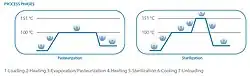 The precise conditions needed to achieve pasteurization and sterilization are controlled by a programmable logic controller (PLC) in millisecond intervals. This level of control in modern units has allowed for the simplification of autoclave technology to the point where heavy and potentially dangerous pressure vessels are not needed, and sterilization conditions are reached by depressing the conversion cell and continuing to evaporate moisture from the product under negative pressure. The result is a statistically safer and more reliable machine, which is also smaller and lighter than older autoclaves.