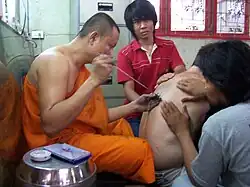 Right before reaching the monk, the people next in line to the one being tattooed will assist the monk with holding the one receiving the tattoo still. The monk uses a single long thin needle about 18 inches in length and about four millimeters in width. The tip of the spike is split into two (like a split cane), so that each stab of the spike produces two dots of ink in the skin. There are about 8 of these needles in a pot of a type of cleaning solution. Sometimes the monk will sharpen the needle with fine grade sandpaper before beginning. The monk will then select from several different rubber templates with the design of choice. He will apply the template to ink and then press it on to the recipients back to transfer the design. When ready to begin, he will dip the tip of the needle into a mix of oil, probably palm oil, Chinese charcoal ink, and possibly snake venom. He then begins to trace the pattern. The typical tattoo takes about 3,000 strikes to complete. The monk dips the needle into the ink about every 30 seconds. When complete, he blesses the tattoo and blows a sacred Kata (Ghata) on it to infuse it with power. For men, the monk uses the charcoal ink. For women he uses a transparent ink and will use a glove in order to not touch the female body.