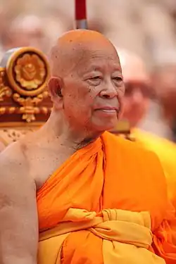 Somdet Chuang used to be monastic Chief of Region in the Northeast, South and North, respectively.[26][30] He later became Chief of the Northern Region and supervised missionary work abroad (ธรรมทูต, thammatut, Pali: dhammadūta), as well as Pali studies.[25][31][32] Moreover, Somdet Chuang significantly contributed to the compiling of a special Tipitaka set in honor of King Bhumibol's sixtieth anniversary.[33] In recognition of his merits, he received honorary degrees from the Mahachulalongkornrajavidyalaya University (MCU), Thammasart University and Sripatum University in Thailand.[31][34][35] He received the royal honorific names Phrasrivisuddhimoli (in 1956), Phraratchavethi (in 1962), Phrathepwarawethi (in 1967), Phra Thamthirarathmahamuni (in 1973), Phrathampanyabodi (in 1987) and Phra Maha Ratchamangalacharn (in 1995).[25][26] His last honorific made him officially a member of the Supreme Sangha Council.[25][31] He has presided over meetings of the council since 2005, when he became the acting Supreme Patriarch.[36][24]