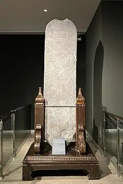 The stele is made of shale in a Bai sema-shaped sheet with a width of 67 cm, a height of 275 cm, and a thickness of 8 cm. The upper left tip of the first side is damaged.[1] It was discovered in 1887 by Lt.Gen. Lord Samosorn Pollakarn (Thai: พลโท หลวงสโมสรพลการ; ทัด สิริสัมพันธ์) in Wat Si Chum's Mandapa tunnel in Sukhothai Old City, while on duty to search for other historical shreds of evidence after the discovery of the Ram Khamhaeng Inscription in 1833.[1] It was sent to be placed in the Bangkok National Museum in 1908, then to the National Library of Thailand for deciphering, and back to be kept at the Bangkok National Museum.[1]