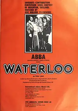 In 1974, after winning the 14th edition of the Melodifestivalen, "Waterloo" represented Sweden in the 19th edition of the Eurovision Song Contest held in Brighton, winning the contest and beginning ABBA's path to worldwide fame. It topped the charts in several countries, and reached the top 10 in the United States.