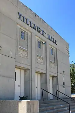 Waverly Village Hall is a rectangular building with a projecting entrance bay. It is constructed of reinforced concrete whose outermost layer was scored to form rectangular panels. A wide set of stairs leads up to three slightly recessed doorways at the main entrance. These were originally double doors flanked by Moderne light fixtures, but have been replaced with single doors and contemporary lights. Lined up above each doorway is a textured panel surrounding a small window.[3] This is surmounted by a metal Art Deco sign reading "Village Hall."[4] The corners of the main section and the entrance bay are rounded and topped with decorative fins. The sides of the main section feature three tall windows flanked by texturing similar to the front façade.[3]
