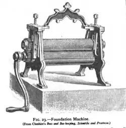 At first, wax foundations were made in the wax foundation press.[1] The first presses were made of wood, while later presses could be made of plaster, cement, and finally metal, which are the ones used today.[1] Wagner also invented the wax foundation rollers, but never perfected them; the first usable rollers were made by Amos Root and precise mechanic Alva Washburn in 1875.[4] In 1895. Detroit inventor Edward Weed invented rollers that can make wax foundation in a continuous roll.[5]