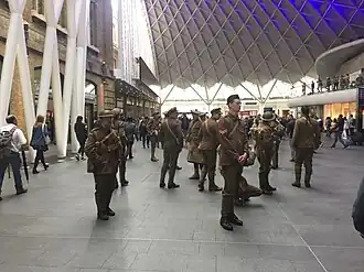 Throughout the day, some 1,600 volunteers, all men, dressed in replica British army uniforms of World War I, appeared in groups at railway stations, shopping centres and other places.[1][4] Each volunteer represented an individual, named, soldier who died on the first day of the battle.[1] When approached, they did not speak, but instead handed cards to members of the public, bearing the name, age and regiment of the person they represented, and the hashtag #wearehere.[1] Deller described these cards as "like small tombstones".[4] From time to time, the volunteers would sing the recursive refrain "We're Here Because We're Here..." to the tune of Auld Lang Syne, as sung in the trenches before the battle.[1]