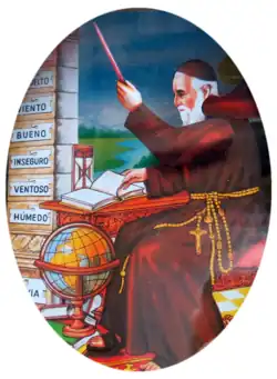 The original model, a copy of which is preserved in the Capuchin Museum of Sarriá,[8] presents the friar standing, although he is currently shown seated and accompanied by a globe at his feet and an hourglass on a table, recalling Ramon Llull in this pose, while the first version resembles the drawing of Brother Ramón de los Pirineos made by Celestí Sadurní Deop in 1876 for the cover of the Hermit Calendar.[8] In addition to having the signs available in several languages[9] ( Spanish, Catalan, Galician, Basque, Portuguese, French, Italian, German and English ),[10] over time around forty variants of the friar have been developed of time (all of them preserved at the Tot Ideas headquarters),[4] as a limited edition of 120. th anniversary of its creation in which the Montserrat massif appears as a background landscape[1] (backgrounds were also created with the Expiatory Temple of the Sagrada Familia and the Cathedral of Santiago de Compostela ),[11] or several minimalist and iconoclasts (with a plain frame or decorated with panots ) in white, yellow, red and black, known as Fraile Colors and marketed on the occasion of its 128th. th birthday,[1][3][11] also highlighting several models in which the friar was replaced at the request of consumers by various figures: nuns (limited promotion), astronomers, a warrior from the Middle Ages, Christopher Columbus, Felix the cat and even trademark friars, including the one that illustrates the bottles of Kina San Clemente, a very popular drink in the 1960s as a restorative for children.[1][9] Regarding the column where the signs indicating the weather appear, this, also the subject of a transformation, has been identified by some as the terminus cross located in the Plaza de Santa Ana de Mataró,[1] a place that the Capuchins used to frequent during his stay in the city between 1610 and 1835.[8]