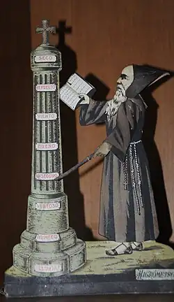 The hygrometer, made of cardboard, shows a figure consisting of a friar of the Capuchin Order[3] with an open book in his right hand and the left arm and the hood of the habit mobile thanks to balanced axes; In this arm he carries a bar thanks to which he indicates the weather approximately 24 hours in advance on various signs arranged from top to bottom on a column while he moves his hood to reveal his head when it is hot or to cover it when rain threatens,[1][8] including the weather conditions "dry", "rough", "wind", "good", "unsafe", "windy", "wet" and "rain", with the friar's functions illustrated in the following verses that accompany the contraption: