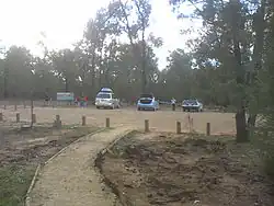 Holy Camp is 19 kilometres (12 mi) south-west of Grenfell,[6] Coordinates 33°53′52″S 148°00′10″E / 33.897857°S 148.002901°E. The last 3.8 kilometres (2.4 mi) are dirt road. It is one of the entrances to the park with a pit toilet, parking area, picnic tables and fireplaces. Camping is allowed. There is a small water tank filled from the toilet roof but don't rely on it. From here it is possible to walk to Eualdrie and Peregrine lookouts.[6] There is much wildlife in and around the carpark including lace monitors and skinks by day and brushtail possums and owlet nightjars by night.