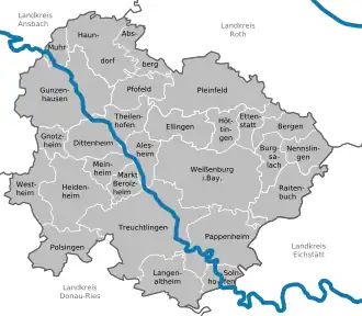 Weißenburg-Gunzenhausen (German pronunciation: [ˈvaɪsn̩ˌbʊʁk ɡʊntsn̩ˈhaʊzn̩] ⓘ) is a Landkreis (district) in the west of Bavaria, Germany with a population of 95,000. Neighbouring districts are (from the north clockwise) Ansbach, Roth, Eichstätt and Donau-Ries. It is located in the south of Middle Franconia, 50 kilometres south of Nuremberg. Largest city and the administrative center is Weißenburg in Bayern.