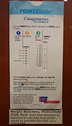 Contrary to several other diets, Weight Watchers does not focus on the calories but simplifies food selection with a points-based system named "SmartPoints", where each food type is assigned a point value calculated according to their nutrient and energy density. A point equals 50 cal. The point values system define both a quality scale and a quantity limit: a food with low point values, such as high fiber carbohydrates, lean proteins, legumes, can be consumed more freely and in higher quantities, whereas food items with higher point values must be eaten with parsimony or avoided. Most fruits and vegetables are "free", as they have a zero points value, and thus can be consumed at will.[1][6]