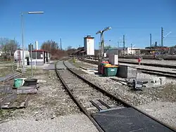 By 1977, Weilheim station had 23 tracks, including five platform tracks. East of the platform tracks there were the local loading tracks, five of which were north and five south of the station building. South of the building there was also the goods shed with a loading dock, equipped with two tracks and a loading road. West of the platform tracks were freight and storage sidings as well as the roundhouse and the turntable of the locomotive depot. Most of the loading and storage sidings were closed and dismantled In the following years and in 2002 and 2004.[5]