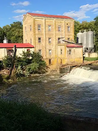 Augustus Weisenberger purchased the property with mill in 1865.[3] The current mill building was built in 1913 to replace the old 1818 stone one.[2] The complex includes a 20-foot wheelhouse and a 1904 20,000 bushel ironclad grain elevator.[2]