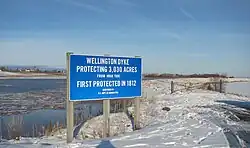 The dyke was nearly complete in 1822 when storm at high tide found a leak on the south side of the dyke and created a breach allowing the Minas Basin to flood in and destroying much of the dyke and years of work. Work was renewed the next year with some assistance from the provincial government. Finally in September 1824 the dyke walls were largely complete. Finishing work on the facings and the addition of a road on top completed the dike in 1825. The total cost was over 21,000 pounds. Aside from 550 pounds from the province, all the costs were covered by the farmers along the river.[5] Many had mortgaged their farms to build the dyke and some faced foreclosure. However, with the dyke's completion, over 3,000 of acres were protected by the single dyke which gave farmers on the Canard River the lowest maintenance costs per acre of any dykelands in the Maritime Region. The road on top of the dyke provided a new connection between Starr's Point and Canard which became known as the Wellington Dyke Road. The dyke also provided protection for numerous roads and bridges further upriver.[6]