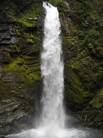 One of the better known falls on the slopes of Mount Baker, the falls are a single plunge of 90 feet (27 m) within a small gorge which the falls mark the beginning of. Several thousand feet downstream from the falls, the creek passes under Wells Creek Road & immediately is joined by Wells Creek's only major tributary, Bar Creek. A large culvert, rather than a bridge crosses the creek along Wells Creek Road.