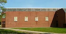 Construction of the fourth (and current) Wells High School began in 1976 and was completed in 1977. The building is located at 200 Sanford Road (ME-109) and was built at a cost of $2.9 million. It was designed by Wilbur R. Ingalls, Jr. The 1937 building became a junior high school that same year.[3] The 1977 building originally had only two stories, but Ingalls designed it so that a third story could be added later if the student population increased. A partial third story was constructed in the late 1980s in order to provide additional classrooms. One of the building's unique design features is that it resembles the letter "W" when viewed from above. The gymnasium was named in honor of Richard Ronco, a 1960 graduate of Wells High School and a member of the Wells School Committee.[8] In 1999, the auditorium underwent interior renovations and was named in honor of Valjeane Olenn, who served as principal of Wells High School from 1986 to 1998.[9] Olenn's tenure as principal was noteworthy for several reasons: she was the first female principal in Wells; she was one of the longest-serving principals of the high school; and she instituted block scheduling, which was new and innovative at the time.