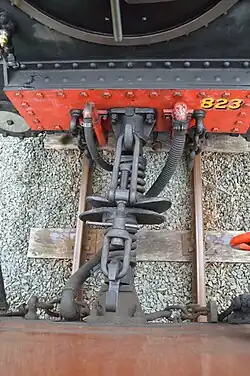 The Grondana coupling now used on the railway, with a centre buffer and screw coupling link[5]
