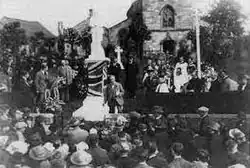 The war memorial in St Mary's churchyard was ceremoniously erected in 1923 to commemorate the men who died fighting in World War I. It was unveiled by Col Herbert Gordon on 26 May 1923 to a crowd of Weltoners, with prayers by the Rev T Naylor, followed by the dedication by the Venerable Archdeacon Blackie, and singing. The memorial was made by A J Tuttell and son of the Monumental Masons in Lincoln, and George William Beeton (1890–1966) was photographed by J Spencer Baldry of Lincoln as a model for masons to use in the making of Welton's war memorial. Memorials using the same reference have since been erected in various villages in Lincolnshire, including Haxey and Metheringham, as well as possibly Soham in Suffolk nearby his hometown,[45] and was also notably used for the memorial that was damaged by the IRA in Enniskillen in 1987.[35][46][47]