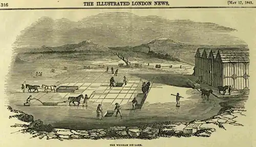 At the end of the 1840s, the ice from Wenham Lake became a luxurious commodity in London. The company opened offices all over Great Britain and Ireland.[2] In large institutions for poor sick people, wrote Florence Nightingale (1859), Wenham Lake ice stopped the milk curdling in summer.[3] By 1888 Mrs Beeton printed a cocktail recipe that used Lake Wenham ice; some Victorian households had iceboxes cooled with it.[4] In 1866, Massey & Son's Biscuit, Ice & Compote Book; Or, The Essence of Modern Confectionery advised wealthy entertainers to "send a block of Wenham Lake ice to the turners to be turned into the form of an elegant vase" to make an "elegant and novel stand."[5]