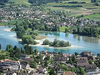 The boundary between the cantons of Thurgau and Schaffhausen, follows the center line of the Rhine here.[3]
