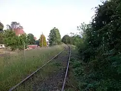Although the Werdau–Wünschendorf–Weida section was opened on 29 August 1876, the halt (Haltepunkt) of Werdau West was opened on 1 February 1916 with the laying of the route through the urban area of Werdau. The station was closed with the abandonment of rail traffic between Werdau and Wünschendorf (Elster) on 30 May 1999. The dilapidated wooden entrance building and the platforms are still in place, but while the station sign still existed in 2006,[7] it has now disappeared. The halt is located in the western part of its track system. The street that leads to the halt, called Straße zum Westbahnhof (street to the West station), marks the former station. Werdau West is the starting point of the Werdauer Waldbahn, which is operated as a museum railway to Seelingstädt.[8]