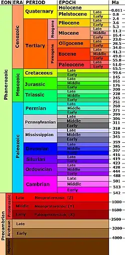 The Wernecke Supergroup was deposited in the paleoproterozoic from >1.84 Ga - 1.60 Ga.[3] The thickness of the deposits seen in the Wernecke Mountains suggests crustal thinning and extension in passive margin or intracratonal environment.[3] The Wompay orogen has been suggested as a possible mechanism behind the initial formation of the Wernecke basin.[9] This hypothesis is supported by both the timing of the orogeny, approximately 1.88-1.84 Ga, and Nd values in the Wernecke Supergroup consistent with Nd values in rocks involved in the Wompay orogen and the Canadian Shield.[3] The oldest exposed sedimentary deposit in the Wernecke mountains, known as the Wernecke Supergroup, comprises Fairchild Lake Group, the Quartet Group, and the Gillespie Lake Group.[3] Together, these groups represent two cycles of basin subsidence and consequent infilling at the western edge of Laurentia. The first cycle represents initial basin development followed by the second cycle, signifying deepening of the basin and marine transgression.[3] The Fairchild group, the oldest and most deformed member of the Wernecke Supergroup is characterized by about 4.6 km of upward grading siltstone to shale with carbonates, representing a low sediment input environment and a shallow basin.[3] The bottom of the Fairchild group is not exposed, but is thought to rest on the crystalline basement.[8] These sediments have since been metamorphosed to slate, phyllite, or fine-grained chloritoid- or garnet-porphyroblastic muscovite-chlorite-quartz schist by the Racklan orogeny at 1.6 Ga, as well as magmatism and hydrothermal activity.[3] The Quartet group records a time of increasing sediment input beginning with shales and coarsening upward to siltstone and carbonates.[3] The Gillespie lake group is characterised by wavy and plane bedding and preserved cross laminations, algal mats, stromatolites, pisolites, intraclasts, and mud-cracks, indicating a shallow water depositional environment.[8]