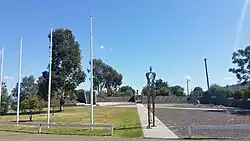 In 1989, a committee led by Chris Holley – a former porter, shunter, guard and controller, strongly supported by a band of fellow retired railmen such as veteran yard master Les Brown – vowed that Werris Creek would not die. Their determination led to the acceptance of a plan envisaged by Dr Stuart Sharp, of the former NSW State Rail Authority Heritage Unit, involving creation of an Australian Railway Monument. The 3-metre (9.8 ft) high stainless steel sculptures this comprises depict a fettler, shunter and firemen, a signalman, gatekeeper and flag lady. The sculptor is Dominique Sutton who also worked on Sydney Olympic Park. They look down on a specially landscaped amphitheatre beside the railway station. Memorial walls complement the amphitheatre and contain more than 2,400 names of all those railway people who had lost their lives either at work or from injuries received at work.[1][3]