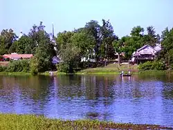 The Susquehanna Boom was a system of cribs in the West Branch Susquehanna River designed to hold timber in the river until it could be processed at one of the nearly 60 sawmills along the West Branch Susquehanna River between Lycoming and Loyalsock Creeks in Lycoming County, Pennsylvania in the United States. The boom was constructed in 1846 under the supervision of James H. Perkins.[3] A boom is a chain or line of connected floating timbers extended across a river, lake, or harbor (as to obstruct passage or catch floating objects).[4] The Susquehanna Boom extended seven miles upstream [5] from Duboistown to the village of Linden in Woodward Township. The boom was constructed by creating a series of man-made islands known as "cribs". These cribs built of local mountain stone and sunken timber were stretched diagonally across the river, beginning on the south side near Duboistown and ending on the north side near Linden. The boom was made of 352 separate cribs that were 22 feet high.[5] The boom was opened and closed at the upper end by a device known as a "sheer boom." It was 1,000 feet long and was controlled with a hand-powered windlass. The sheer boom gathered the logs into the main boom that was capable of holding up to 300 million board feet (710,000 m3) of logs. The lower end of the boom was where the logs were sorted. The mills in Williamsport, South Williamsport, and Duboistown each had their own distinctive brand burnt into the logs. The men working at the end of the boom would sort the logs according to their corresponding brand and float them into the correct holding pond along the bank of the river. During the height of the lumber industry in Lycoming County, 1861–1891, the various mills produced 5.5 billion board feet (13,000,000 m3) of lumber. Williamsport became one of the most prosperous cities in Pennsylvania and in the United States. Men like James H. Perkins, Peter Herdic, and Mahlon Fisher became millionaires while many of the men who actually worked in the river struggled to survive on the wages paid to them by the lumber barons.[6]