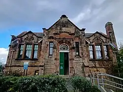 West Calder has a public library that is a Carnegie library and was built in 1903 to a design by William Baillie.[15][42][43] Built of red and grey Ashlar stone, the building is a fine example of the Art Nouveau style, with detailing around the entrance and pedimented Venetian windows.[15] Stone inscriptions include the words science and poetry. The building still includes original tiling and glass.[15] The library is Category B listed.[42] In 2016, the library was refurbished following a £500,000 renovation.[44]